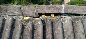 Hierdoor zijn de bovenste dakpannen onder de nok uitgezakt, wat weer een grote lekkage veroorzaakt heeft tot zelfs bij de buren.
