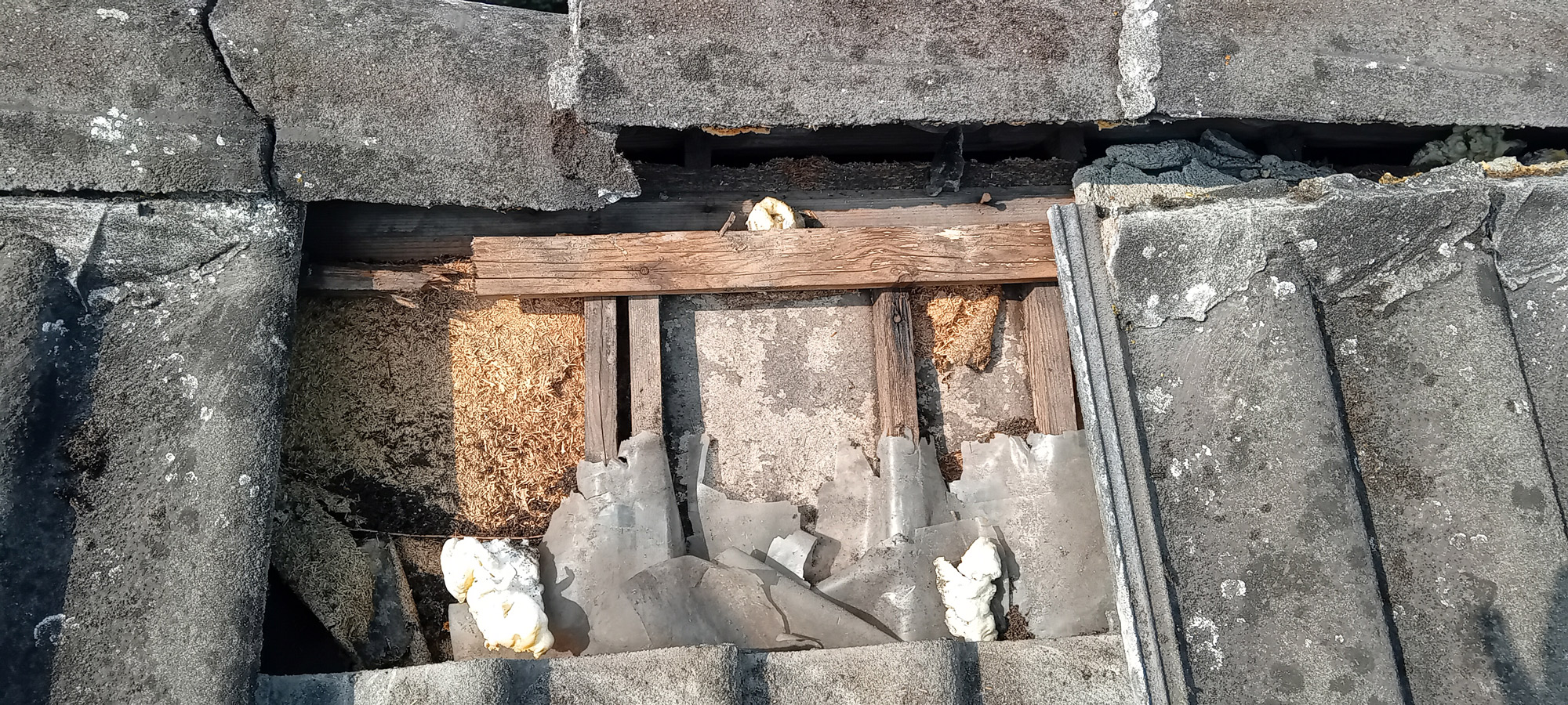 Hierdoor zijn de bovenste dakpannen onder de nok uitgezakt, wat weer een grote lekkage veroorzaakt heeft tot zelfs bij de buren.