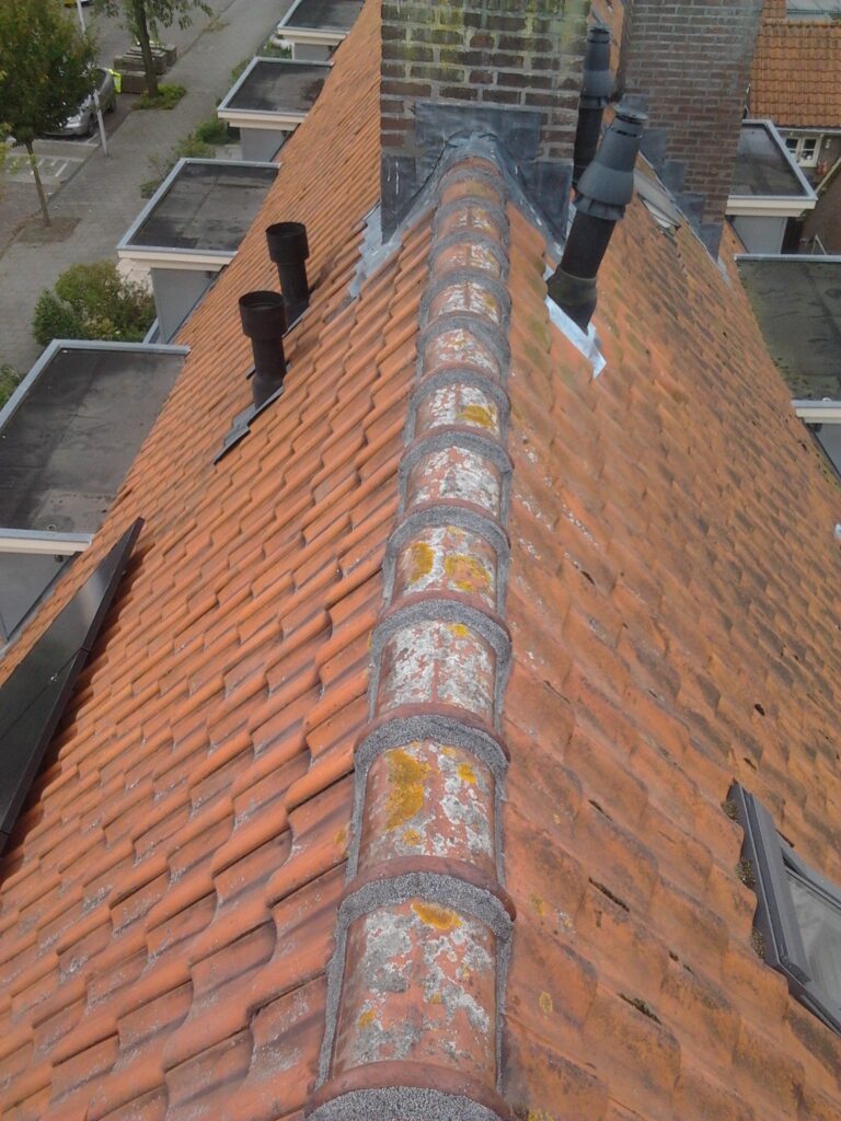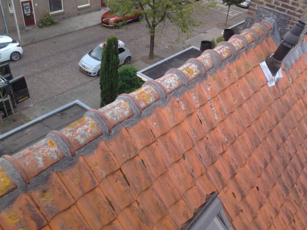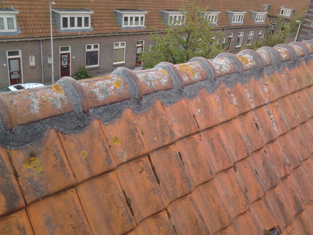 De dakpannen en nokvorsten zijn van ander materiaal dan het cement waar ze mee vast liggen. Deze krimpen dus harder en zetten meer uit bij de wisseling van warmte en kou.