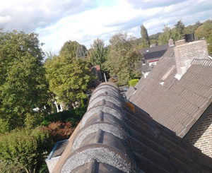 Nokvorst reparatie in Obdam De mensen hadden last van lekkage bij een bepaalde windrichting met regen. Dit is vaak een teken dat de nokvorsten slecht zijn geworden. Naar enige onderzoek bleek ook hier het cement onder de nokvorsten poreus zijn te geworden. Het cement werkt dan als een spons en zuigt de regen op. Bij een bepaalde wind met regen op de nokvorsten,werd het cement zo verzadigt van het vocht dat deze doorsloeg naar binnen.   De nokvorsten zijn gerepareerd met flexim ...